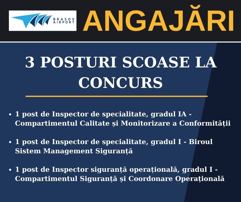 Regia Autonomă „Aeroportul Internaţional Braşov-Ghimbav” RA a dat publicităţii un anunţ de recrutare privind scoaterea la concurs a trei posturi, după cum urmează: