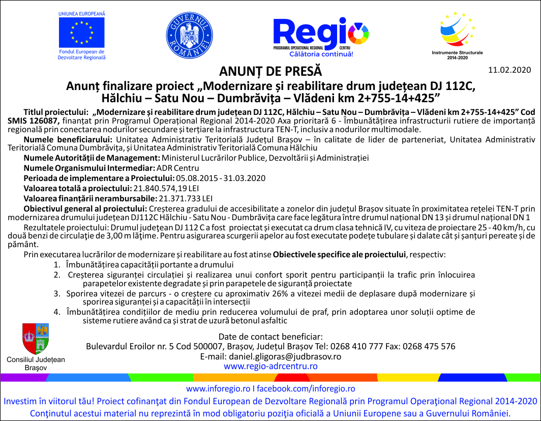 • Anunţ finalizare proiect „Modernizare şi reabilitare drum judeţean DJ 112C, Hălchiu - Satu Nou - Dumbrăviţa - Vlădeni km 2+755-14+425” jpg (1124kb) [vizualizează] [descarcă]